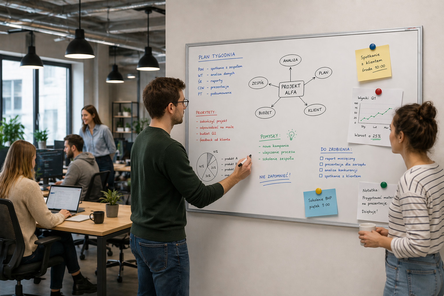 • 1 szt. tablicy magnetyczno-suchościeralnej w ramie aluminiowej o wymiarach 120 x 60 cm