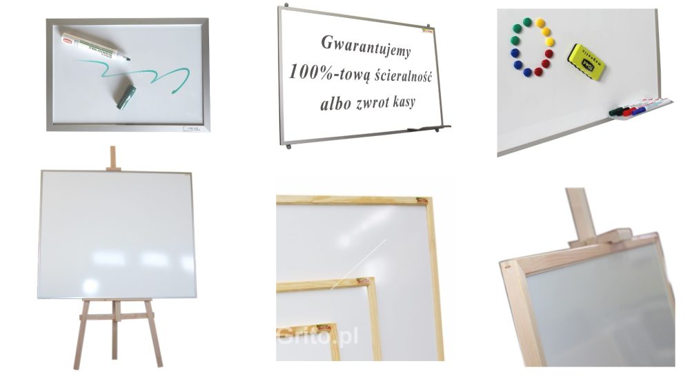 PowierzchniaBlacha typu Whiteboard (lakierowana, biała o właściwościach suchościeralno-magnetycznych, usztywniona z tyłu płytą pilśniową miękką, grubość 9,5 mm)